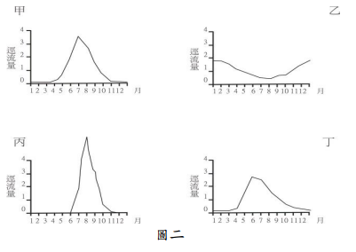 45.圖二中,甲、乙、丙、丁分別代表四條河流逕流量的變化。 哪條河流的逕流量變化,受海洋的調節最為明顯?