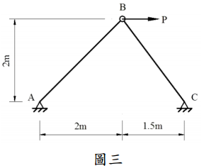 【已刪除】三、如圖三所示,AB 及 BC 二根桿件在 B 點鉸接,已知 AB 及 BC 桿件使用的材料皆 為鋼(E=200 GPa),AB 桿件的斷面為直徑 5 cm 的圓形,BC 桿件的斷面為直徑 2 cm 的圓形,在 P=70 kN 的水平力作用下,試求 B 點的變位。(25 分)