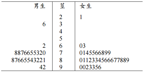 【已刪除】四、下圖是 61 位學生在某門課上成績的莖葉圖,請根據圖回答下列問題(回答下列問 題時,請將男女生的得分一併考慮):(30 分)