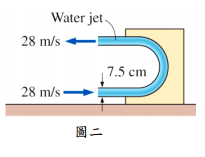 【已刪除】三、一直徑 7.5 cm 的水平噴射水柱衝擊一曲面滑塊,水柱水平衝擊速度為 28 m/s(如圖 二所示)。不考慮滑塊與平面之摩擦,需多少力作用在滑塊上才能阻止滑塊移動? 假設動量修正因子(momentum correction factor)為 1。(水密度為 1000 kg/m