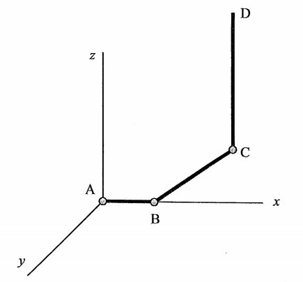 【已刪除】4.有一個三連桿機構如下圖所示,AB桿長1 m、BC桿長2 m、CD桿長3 m,AB桿以角速 度1j繞少軸旋轉,BC桿相對於AB桿的角速度為2i,而CD桿相對於BC桿的角速度為3k, 請求得圖示瞬間D點的絕對速度。(20 %)