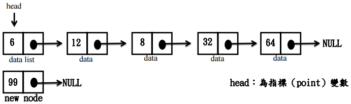【已刪除】六、在下列單向鏈結串列(Linked lists)將新節點 99 插至 6 節點之前當作串列之首。請 以程式碼寫出插入過程。(20 分)