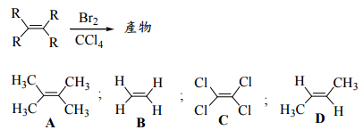 【已刪除】七、溴在四氯化碳溶液顏色的消失,常使用於檢測烯類是否存在,下列四種烯 A~D,請 依化學活性由大至小排列,例如甲>乙>丙>丁,表示丁在溴溶液活性最小。(5 分) 並且說明你排列的理由。(5 分)