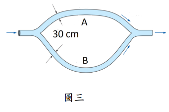 【已刪除】四、一供水並聯管路系統如圖三所示,管路 A 和 B 之管徑均為 30 cm,管路 A 之長度為 1500 m,管路 B 之長度為 2500 m,兩管內流況均為完全紊流(fully turbulent flow), 假設兩管內之摩擦因子 f(friction factor)相同,若管路 A 之流量為 0.4 m