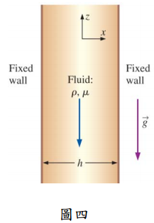 【已刪除】五、假設穩態(steady)及不可壓縮(incompressible)的黏性液體在兩無限長的垂直板 間平行流動如圖四所示,其流況為層流(laminar flow),兩板間距為 h,重力加速 度g r 之方向為卡氏座標之負 z 方向,液體流動純粹由重力驅動,無任何外力作用, 且流場內壓力為常數,試以 Navier-Stokes 方程式