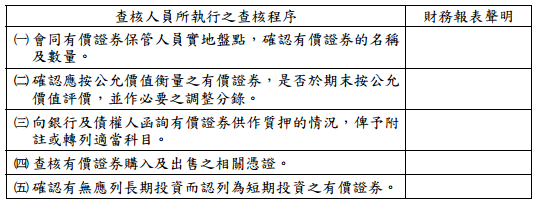 【已刪除】三、查核人員對受查公司帳上之有價證券投資項目執行下列之查核程序,請依下列格式 說明各項查核程序所獲取之查核證據得以支持之財務報表聲明: (每小題 3 分,共 15 分)