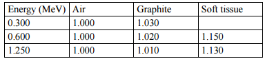 、電容為 5 pF,照射 Co-60 之前的電壓為 200 V、照射後電 壓為 160 V,游離腔壁的相對質量阻擋本領(relative mass stopping power, Sm/Sair) 如下表,請計算若將一軟組織置放於上述氣腔的位置與照射條件下,軟組織的吸收 劑量為多少(mGy)?(20 分)