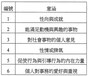 【已刪除】 (一)請將「A.氣質」、「B.動機」、「C•興趣」、「D.能力」、「E•價值觀」、「F.社會態度」 等6個人格特質名詞,與下列比較吻合接近意涵說明者,進行配對••(6分,可 以編號配對作答)