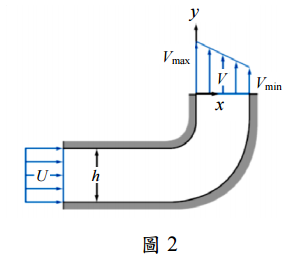 【已刪除】二、水以均勻速度 U,進入一個固定寬度 h =75.5 mm 的二維通道中。通道有一個 90 度 轉彎,此彎曲結構會扭曲流動情況,形成在出口處的線性速度分佈,如圖 2 所示, 其 V