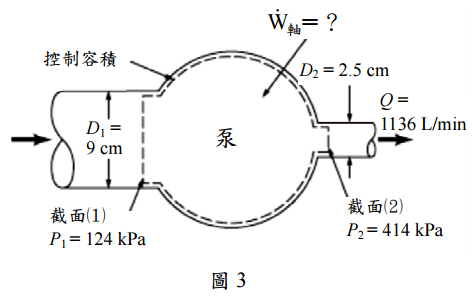 【已刪除】三、泵以穩定流率 1136 L/min 輸送水,如圖 3 所示。在泵上游處截面⑴的管徑為 9 cm、 壓力為 124 kPa,而在下游處截面⑵的管徑為 2.5 cm、壓力為 414 kPa。流經泵的水 位高度變化為零。水流經泵的溫度上升的內能增量為 278 N.m/kg。若泵吸過程為 絕熱,試求泵所需的功率為多少 kW?(25 分)