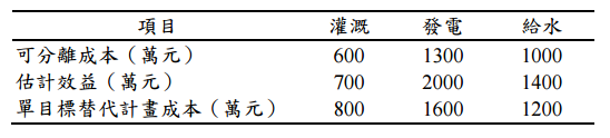 【已刪除】五、一多目標水資源開發計畫總成本為 3400 萬元,各標的之成本、效益資料參見下 表。請以剩餘效益法(remaining‐benefits method)計算各標的應分攤之成本與獲得 效益。(20 分)