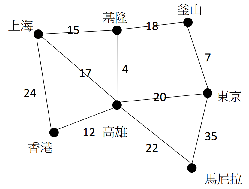 【已刪除】某航運公司將該公司航運的路線和據點,以及其間的距離,繪製出如下圖。 圖中二據點(節點)之間的邊的長度(邊上的數字)代表二據點之間的距離。如果要 用關連(relation)的方式來表達這個圖形的資料,請問此關連的結構應該是如何 的? 並請將此圖形資料存入該關連中之後的結果寫出。