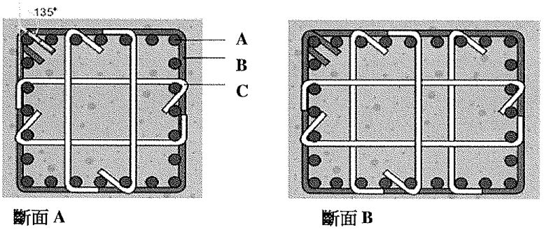 6. 下圖為建築構造柱筋斷面,請問編號「B」為箍筋;編號「C」為繫筋。