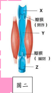 (A)在該狀況下,Y處的血壓較X處為高 (B)當肌肉放鬆時,血液自X流向Y (C)當肌肉收縮時,血液自Y流向Z (D)肌纖維為多核,無橫紋