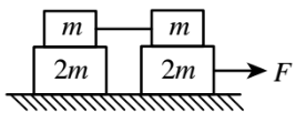 【已刪除】10、如圖所示,光滑水平面上放置質量分別為 m 和 2m 的四個木塊, 其中兩個質量為m的木塊間以不可伸長的輕繩(質量不計)相連,木塊間的靜摩擦力係數是 μ。現用水平拉力 F 拉其中一個質量為 2m 的木塊,使四個木塊以同一加速度運動,則輕繩對 m 的最大拉力為何?