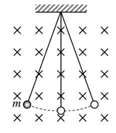 ,錘擺為絕緣體,質量為 m,且均勻帶有正電荷 q, 在一均勻在水平磁場 B 中做小角度的擺動,磁場方向與單擺的運動面互相垂直(如右圖)。設重力加速度為 g,若擺鍾通過最低點時速率為 v,當擺錘由右向左通過最低點時,擺線張力為 T,而由左向右通過最低點時,擺線張力為 T',則 T–T' =?