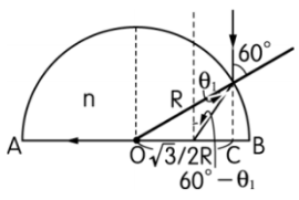 【已刪除】21、如圖所示,透明半圓形介質,半徑為 R,若光線在半圓面入射,恰在 OB 面發生全反射, 已知