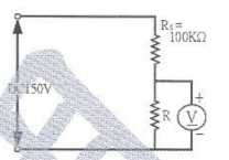 1.直流50伏特之電流表,其靈敏度為1KΩ/V,當接成如右圖之電路時,電壓表指示值為30伏特,則R之電阻值為多少?