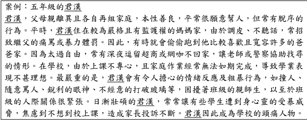 【已刪除】四、請就以下案例,試論如果你是該生升上六年級時的新任導師,請分析該生行為偏 差的問題成因,並提出輔導的因應策略為何?再者,為使班級氣氛和諧、安全, 及防止家長再投訴,你可以運用那些方法與資源,促進家長們的理解。