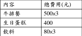 【已刪除】4. 阿飛原本每週一三五的晚上固定當家教老師 2 小時,工資 500 元/時。為了好友大偉生日, 他週五請假一天,找了閒閒沒事的朋友阿陳一起幫大偉慶生,花費二人均分。下表為阿飛 與阿陳替大偉慶生的花費。請計算隱含成本、外顯成本各是多少?