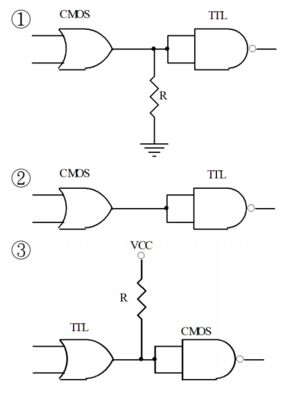 165. 當 TTLIC 與 CMOSIC 使用相同電源時,下列電路接法何者較為適當?