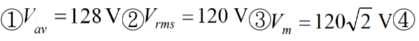 174. 有一交流電壓為 V(t)=100 sin100πt,下列敘述何者正確?(A)Vm=200√2 V(B)Vav=100V(C)Vrms=100V(D)f= 50Hz。
