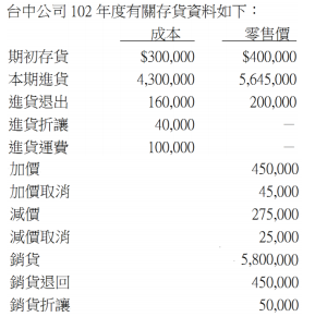 在平均成本與淨變現價值孰低零售價法,下列敘述何者正確(A)期末存貨零售價為$650,000(B)期末存貨零售 價為$700,000(C)期末存貨成本為$525,000(D)期末存貨成本為$468,000。