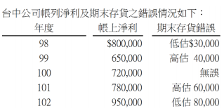 有關台中公司各年度正確之淨利,下列敘述何者正確(A)99 年度為$720,000(B)100 年度為$760,000(C)101 年度 為$720,000(D)102 年度為$810,000。