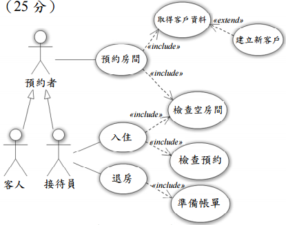 【已刪除】二、下圖為旅館管理系統的使用案例圖,請問由該圖中可得知應該繪製幾張使用案例 表?每張使用案例表包含那些使用案例?其名稱為何?相對於這些使用案例表應該 繪製幾張活動圖?(25 分)