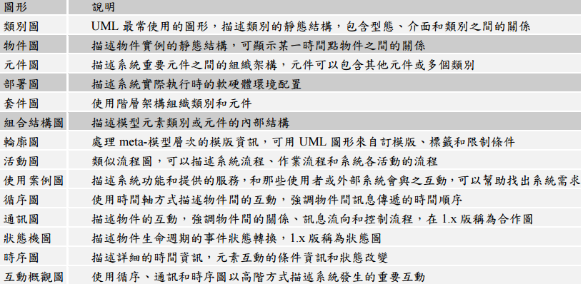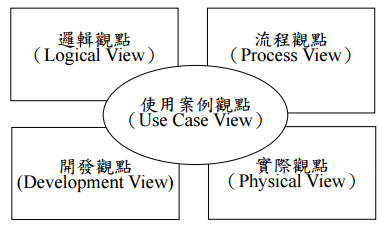 【已刪除】四、統一塑模語言的 4+1 觀點可呈現不同種類統一塑模語言圖形在描述整個系統模型時 扮演的角色,稱為觀點模型(View Model),可同時使用多個不同觀點來描述系統架 構,如下圖所示。統一塑模語言常用圖形如下表所示。請分別列出 4+1 觀點中各觀 點所常使用的統一塑模語言圖形各為那些?其中那一觀點在物件導向塑模之系統分 析與設計之系統發展生命週期各個階段中皆必須參與使用?(25 分)