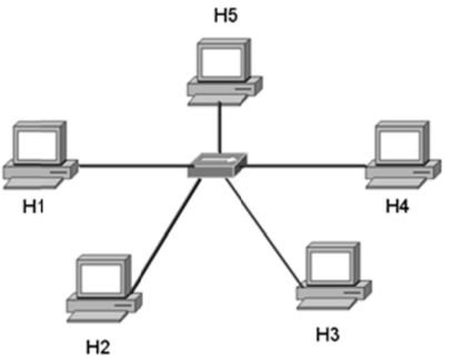 23.請參見圖示 H2的訊息 。五台PC透過一個集線器連接 下面哪一個說明正確? 如果主機H1想回覆來自