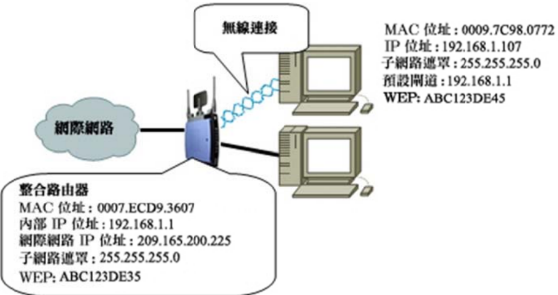 (A)主機的WEP金鑰不正確。 (B)主機的IP位址不正確。 (C)主機的子網路遮罩不正確。 (D)主機的預設閘道不正確。