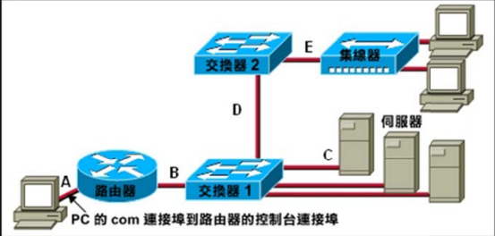 (A) A=直通, B=控制台 ,C=交叉 ,D=交叉 ,E=直通 (B) A=直通, B=直通, C=直通, D=交叉, E=控制台 (C) A=控制台 ,B=直通 ,C=直通 ,D=交叉 ,E=交叉 (D) A=控制台 ,B=交叉 ,C=交叉 ,D=直通 ,E=直通