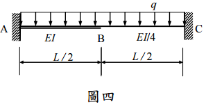 【已刪除】四、一兩端固定之變斷面非均勻梁 ABC,AB 之撓曲剛度為 EI,BC 則為 EI/4。今承受一 均佈載重 q 如圖四所示,試以傾角變位法求該梁中央 B 處之垂直撓曲變位。(25 分)