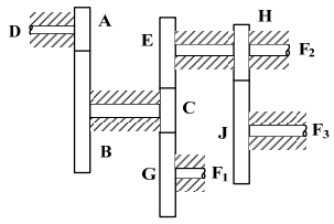 由轉速 3600 rpm 順時針方向之主動軸 D 來帶動, 求各從動軸 F