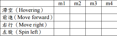 【已刪除】⑴以快(fast)、慢(slow)、相同(same)等關鍵字表示馬達間的相對轉速,填入 下表,說明飛行控制(請依所列格式繪製於試卷上作答)。(8 分)