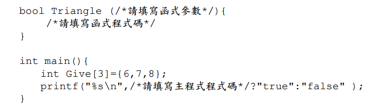 【已刪除】一、依據下方 C 語言程式碼,請完成ㄧ布林(Bool)型態之函式 Triangle( ),並填寫呼 叫此一函式之程式碼。此一函式參數包含整數型態陣列 Edge,Edge 陣列內含有三個 代表三角形邊長之數值。請撰寫判斷此三個邊長是否可構築成為一個三角形之函式, 函式運算後,依回傳結果分別顯示 true 或 false 値,分別代表能否構成三角形。(25 分)
