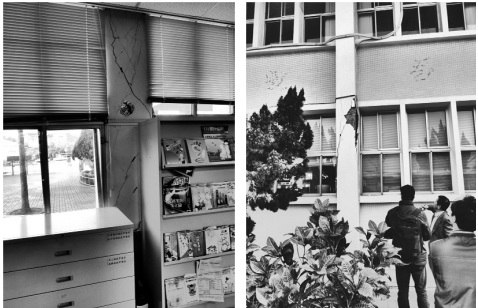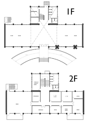 【已刪除】四、既有鋼筋混凝土結構物耐震能力不足可能歸咎於以下幾項因素:⑴設計年代的結構 物耐震設計標準較低;⑵結構系統規劃欠佳;⑶結構物耐震設計不良;⑷施工品質 欠佳;⑸結構物老劣化或其他等因素。 以圖示 2016 美濃地震中建築物損害為例,其壹樓為公共使用,二樓為小隔間辦公室。 牆圖例:粗體為 1B 磚牆,細體為