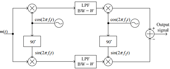 【已刪除】二、圖一為 SSB 的調變器,其中低通濾波器(LPF)為頻寬 W 之理想低通濾波器。若輸 入訊號 m(t ) = cos(2π f
