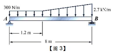 第三題: 如【圖 3】一個承受分佈力的樑結構,求解支持處 A 及 B 的反應力分別為何?
