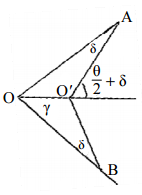 【已刪除】三、如示意圖,水平角為∠AOB = 60°,照準距離 OA = OB = 100 m。若定心誤差(OO' = γ) 於角度平分方向上,其引起之角度觀測誤差(2δ)為 6",則所對應的定心誤差應為 多少?(20 分)