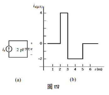 【已刪除】四、圖四為一 2 pF 電容器之電路(a)及施加之電流源(b)。若電容器之初始電壓(t = 0) 為-1 mV,請求此電容器電路對應之電壓變化。(20 分)