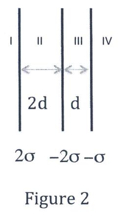 16. Three parallel infinite sheets with charged densities are 2σ, -2σ and σ C/m² respectively and separate 2d and d, as shown in fig. 2. These sheets divide the space into four parts, I, II, III, and IV. Which two regions have the same electric field. (A) I and II (B) II and III (C) II and IV (D) I and III