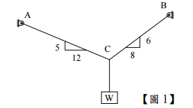 【已刪除】11.如【圖 1】所示,W重 70 kg,由 2條鋼索支撐,請問此 BC鋼索所承受之張力為______kgf。(鋼索重量不計)