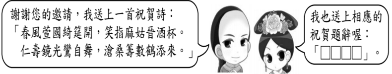 11. 下圖二人受邀出席一場宴會,依祝賀詩的內容,□□□□內的題辭應是:
