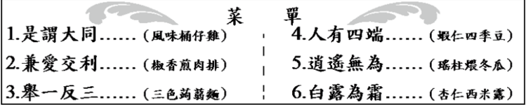12. 古代典籍可分為「經、史、子、集」四部。下圖菜單的四字創意菜名,何者的原始出處來自 「經」部典籍?