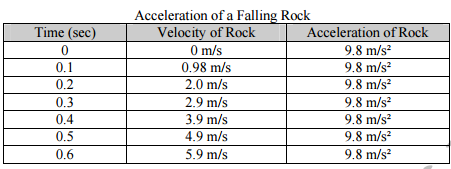 15. A rock falls from a cliff. The table shows the speed and acceleration of the rock at different times.