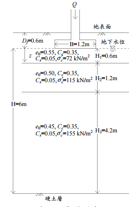 ,基礎砌置深度為Df = 0.6 m, 由試驗室得知各土層之參數如圖所示(圖中 e