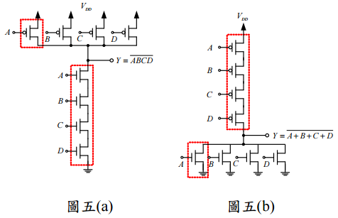 【已刪除】五、圖五(a)、(b)分別為四輸入之 Complementary CMOS 反及閘(NAND gate)與反或閘 (NOR gate)邏輯電路。此類邏輯電路由 pull-up network(PUN)與 pull-down network(PDN)構成,其最適當之寬長比設計,為 PUN 與 PDN 導通之電路均等效 一個基本反相器(basic inverter)(如虛線框內電路)。若以 n 與 p 分別代表 NMOS 與 PMOS 之寬長比(W/L),且 p = 3 n,計算 NAND gate 與 NOR gate 邏輯 電路以 n 為單位之總面積分別為何?(20 分)