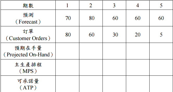 【已刪除】六、請依格式在試卷上完成下列主生產排程表,期初存貨=120 單位,MPS 訂購批量=100。 (15 分)